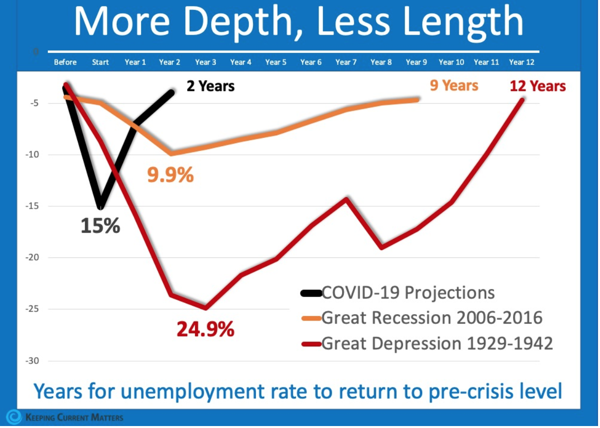 When we compare that to the length of time it took to get back to work during both the Great Recession (9 years long) and the Great Depression (12 years long), we can see how the current timetable is much more favorable.