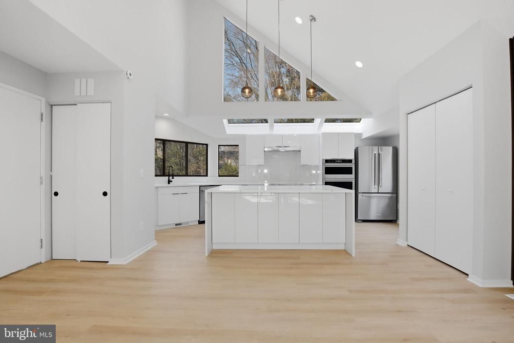 A truly stunning and impeccably renovated 3-level Contemporary single-family home offering 4 bedrooms and 4.5 baths in desirable North Reston. This architecturally striking residence blends modern elegance with refined finishes throughout. The gourmet kitchen is a true showpiece, highlighted by soaring ceilings and skylights that flood the space with natural light. Premium stainless steel appliances include a wall oven and microwave combo, refrigerator, cooktop, designer range hood, dishwasher, and wine cooler. Quartz countertops, a dramatic waterfall center island, and high-gloss luxury modern cabinetry create a sleek and sophisticated statement. Just beyond the kitchen, the home opens to a dramatic high-ceiling dining and living area filled with light and design-forward details, including a stylish accent wall—an ideal setting for both entertaining and everyday living. The main-level primary suite offers exceptional convenience and luxury, featuring a spacious walk-in closet and a completely renovated spa-inspired bath with a freestanding soaking tub, glass-enclosed shower, oversized double vanity with a built-in makeup station, new toilet, designer mirrors, lighting, and new tile throughout. A unique highlight of the primary suite is direct access to a private entertainment lounge complete with a wet bar, sink, and wine cooler—ideal for hosting or relaxing. This space also offers exterior access, enhancing flexibility and functionality. A modern powder room completes the main level. Upstairs, two additional bedroom suites each feature newly renovated private baths—one with a standing shower and one with a bathtub—providing comfort and privacy for family or guests. The fully finished lower level includes a fourth bedroom and a brand-new full bath with a shower, along with a spacious recreation room perfect for a media area, gym, or playroom. Extensive updates include: New flooring throughout; Fresh interior paint; New designer light fixtures. Enjoy walking to lake, close to Reston town center, hospital, etc. Can walk to the nearest restaurants. Quick access to Fairfax County Parkway, the Dulles Toll Road, and Metro bus lines, along with walkability to the local elementary school. This home offers architectural distinction, lasting quality, and smart updates—all in an unbeatable location. A truly special offering—this is the dream home you’ve been waiting for.