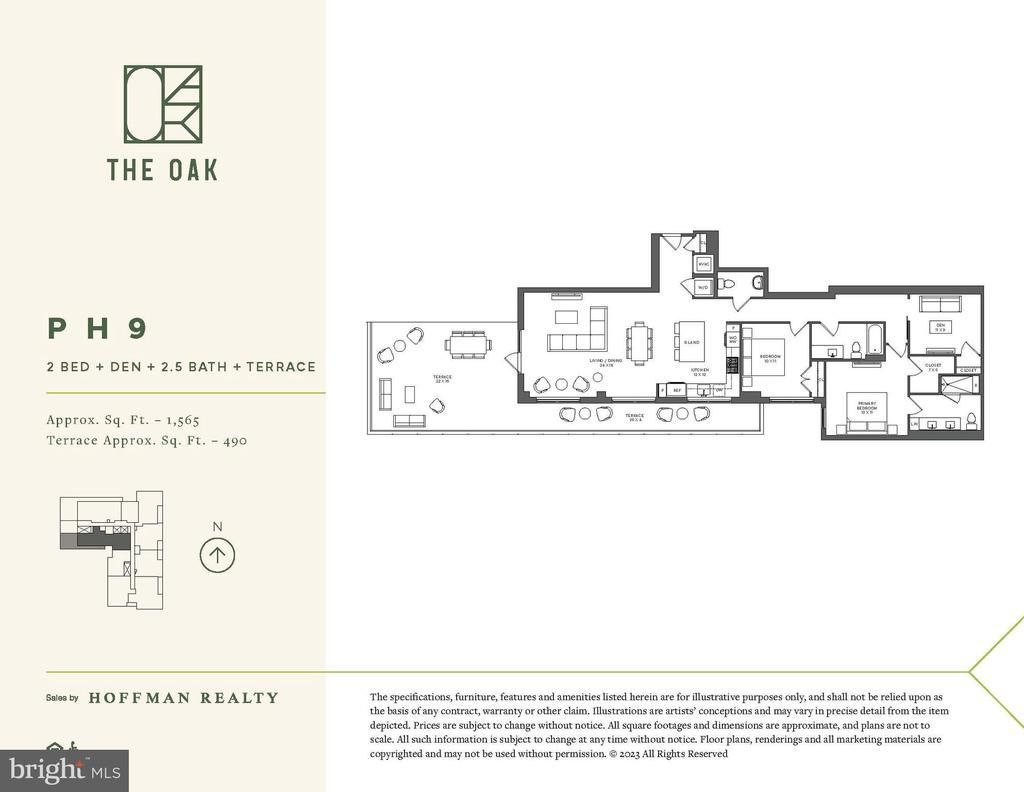 Schedule an appointment to tour The Oak, now over 55% sold and "move-in" ready. Unit PH9 is a 2BD, Den, 2.5BA penthouse unit with an outdoor terrace and includes 2 parking spaces. This unit has an open floorplan, two-tone European inspired frameless kitchen cabinetry, matte black hardware and fixtures, quartz countertops, tile kitchen backsplashes, kitchen islands, ENERGY STAR® Bosch kitchen appliances, full-size GE washer/dryers, LED light fixtures, Porcelanosa wide-plank wood-style flooring, high ceilings and expansive windows. Building Amenities Include: 5,000 SF outdoor terrace with gas grills, bar seating, dining and lawn, cozy penthouse terrace with dining and lounge seating, residents’ lounge with fireplace, lounge and communal dining, fitness center with cardio equipment and free weights, 24-hour front desk, secure bike storage, car detailing station, and pet washing station.