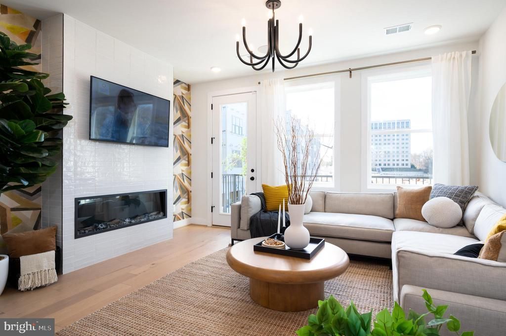 The open and airy main living level features a light-filled great room, a spacious dining room, and a stylish center kitchen. The chef’s dream kitchen is complete with Calacatta Gold quartz countertops, Artisan Maple Fog cabinets, Brushed Satin Nickel hardware, and KitchenAid stainless steel appliances. Upstairs boasts a stunning primary suite with two walk-in closets and a primary bath with stone countertops. The second level also has a spacious secondary bedroom with a private full bath. The third level offers an additional bedroom, full bath, a loft that is the perfect flex space, and a rooftop terrace. Photos shown are of the Clermont Model.